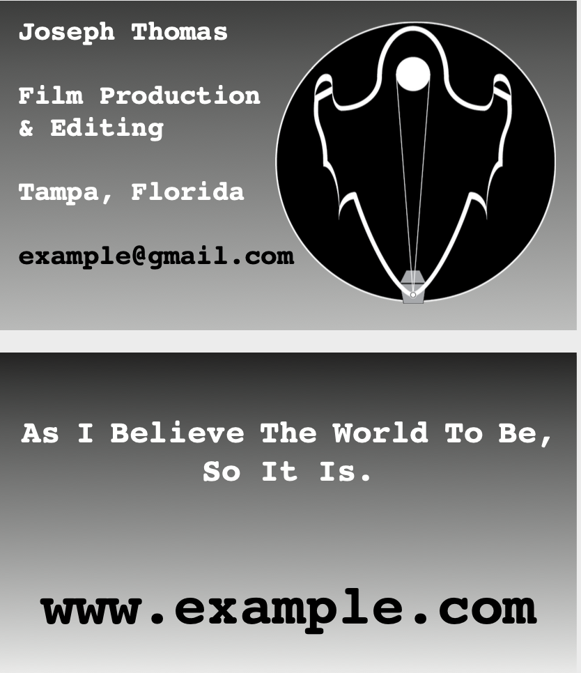For my business card project, I wanted to stay with a black and white aesthetic, similar to the expressionistic films of the 20th century. Additionally, I have continued to update my logo design, including adding some more color, but keeping a mostly black and white color pallet. For my first card design, i chose to follow a look that was inspired by film strips, including some discoloration on the sides for added effect. For my other cards, I chose to use a gradient effect to replicate a projector effect. Two of my cards use the term "As I Believe The World To Be, So It Is," which comes from old magic and alchamy rituals and philosophies. I think this saying ties heavily into filmmaking as anything can be created through the artform, and as common metals can be turned into gol with alchamy, simple scenes shot on sound stages could be transformed into a great piece of cinema with the propper resources.